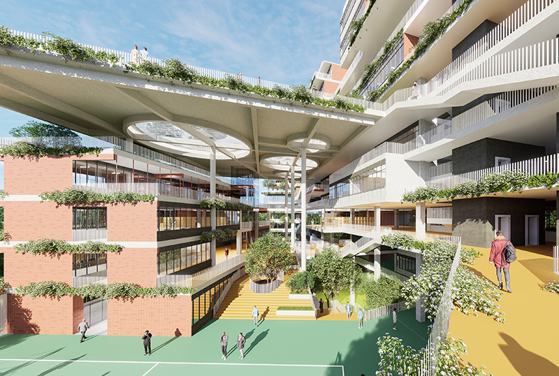 This project is located in Dhaka, Bangladesh, with a total site area of 7,489.41 square meters and a capacity of 100 classes/5,000 students. The building area is 43,796 square meters. The design cleverly connects the teaching buildings with the auditorium through terraced sky garden platforms, creating overlapping green spaces that evoke the feeling of being in a forest. The variously shaped public spaces become ideal areas for outdoor communication, sharing, and interaction, providing diverse space usage options for both students and teachers. The layered spatial design fosters greater connections and interactions, blurring the boundaries between the inside and outside. The open circulation spaces offer unobstructed views both inward and outward, while the staggered terraces bring the outdoor landscape into multiple functional areas within the building.
