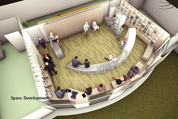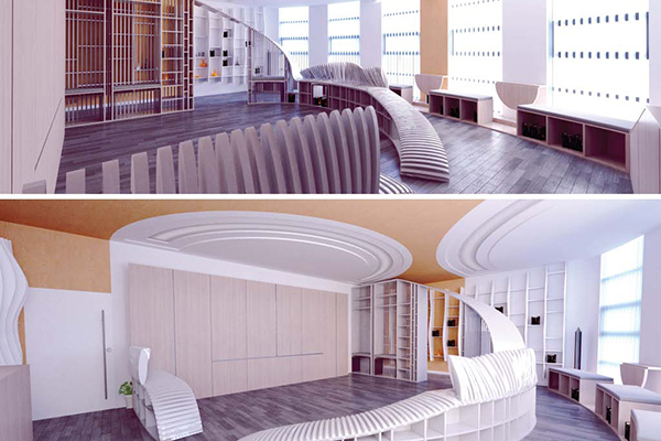 这个方案选用的是钢木结构,从用料和加工度上来说比较容易实现,形成的空间面貌完整,设计语言较简洁。方案中的下沉空间以及抬起的空间联合形成了一个空间层次的变化,让人感觉有活力。在满足阅读、休憩和小型聚会这样的功能上做得出色,但是对于较为正式的场景如大型会议来说,存在不合适之处,需要改进。